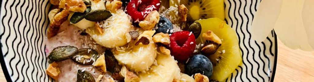 - Den Quiona- Porridge in zwei Schüsseln verteilen und jeweils 100 g Joghurt dazugeben und mit dem Porridge verrühren.
